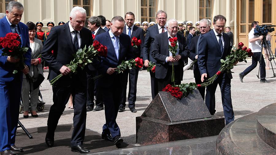 Губернатор Ленобласти Александр Дрозденко, полпред президента РФ в СЗФО Александр Гуцан, губернатор Санкт-Петербурга Александр Беглов (слева направо) и помощник президента РФ Владимир Мединский (справа) на церемонии открытия памятника императору Александру III в Гатчине, 5 июня 2021 года
