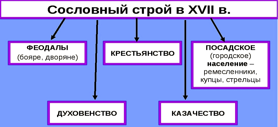 Господствующее сословие — феодалы. Прежде всего это бояре, имевшие свои родовые земельные владения — вотчины. В XVII веке по мере утверждения российского самодержавия усиливались позиции дворянства, которое постепенно превращалось в новое сословие.
