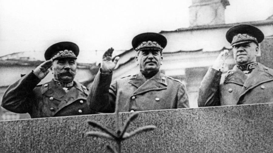 Семен Буденный, Иосиф Сталин и Георгий Жуков на Параде Победы 1945 года