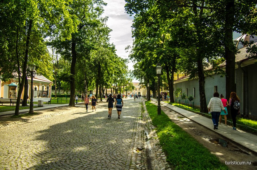 Главная аллея Петропавловской крепости тянется от Петровских ворот до Петропавловского собора.