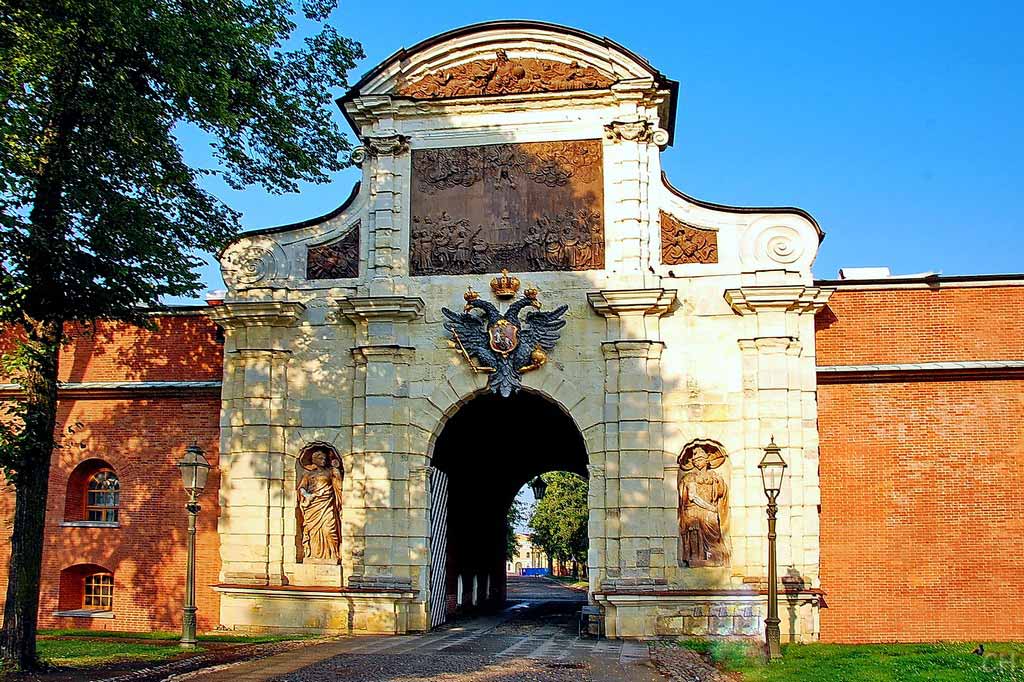 Главный въезд в укрепление проходит через Петровские ворота. С двух сторон остров закрывают два равелина. Иоанновский получил свое имя в честь родного брата Петра I, а Алексеевский – в память об их отце.