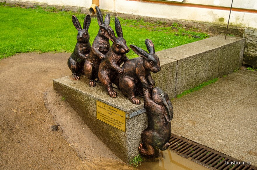 Чуть дальше по аллее, у входа в комендантский дом расположилась скульптурная композиция «Спасающиеся зайцы».