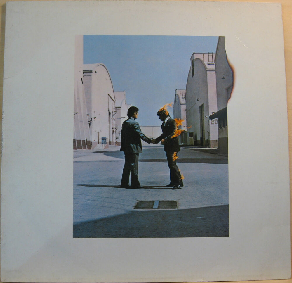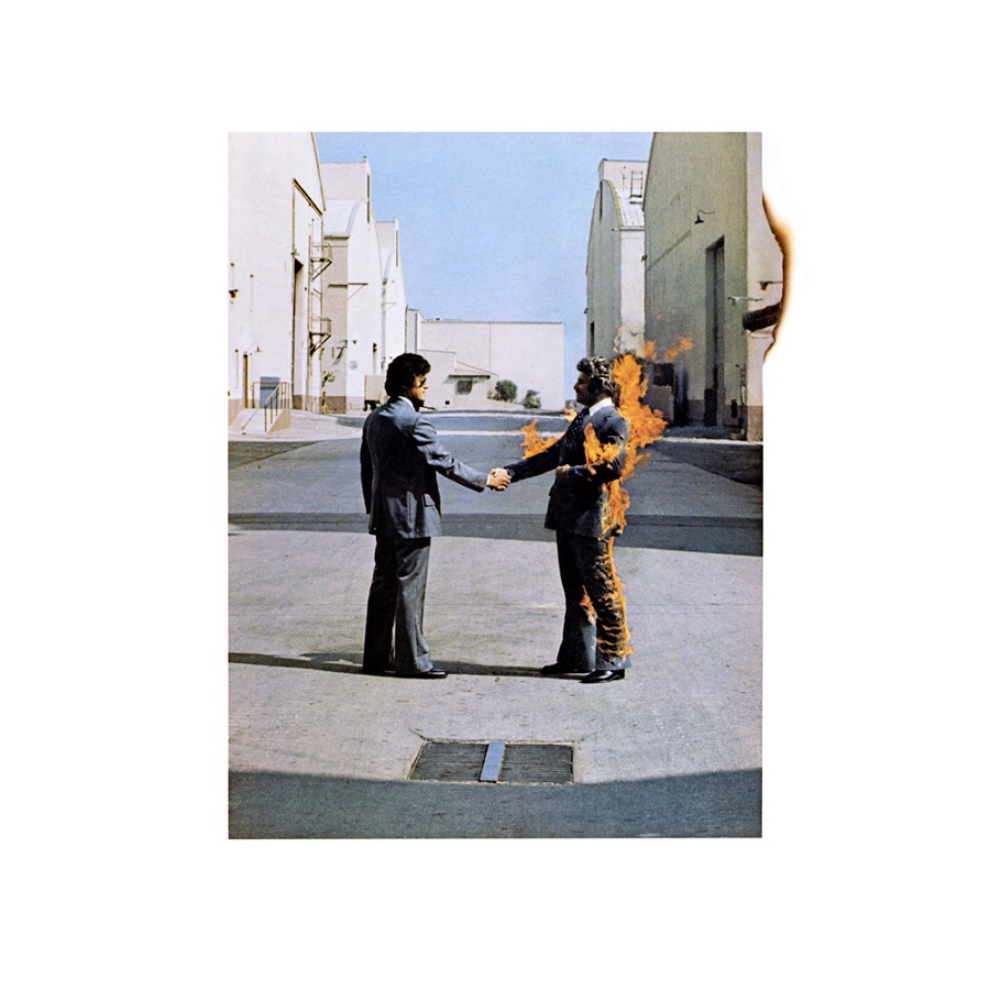 Еще одна крайне популярная обложка. На ней изображен бизнесмен, пожимающий руку своему «двойнику» — данное действие символизирует термин «сгореть» (на работе, прогореть в бизнесе и т.д.), что олицетворяет скрытие людьми своих настоящих, истинных чувств.Вопреки расхожему мнению — это не рисунок, а настоящая фотография. Для ее реализации были приглашены два каскадера, один из которых надел пиджак с брюками поверх огнеупорного костюма. Его голова была защищена специальным капюшоном на который был надет парик. В начале на съемках ветер дул не в ту сторону из-за чего огонь попадал в лицо каскадеру, обжигая усы. Тогда было решено поменять их местами и все стало как надо.Кстати, сам альбом продавался в черной полиэтиленовой упаковке — Сторм Торгерсон заметил, что в музыкальных магазинах копии диска Roxy Music Country Life продавались закрытыми в непрозрачный зелёный целлофан, чтобы скрыть от глаз подростков фотографию украшавших его двух моделей с открытой грудью. Это натолкнуло Торгерсона на мысль поместить визуальное решение Wish You Were Here в схожую чёрную или синюю оболочку так, что сама обложка будет «отсутствовать». Таким образом, можно добиться эффекта двух обложек: одна для публики и одна — для торговли. Для передачи смысла песен «Welcome to the Machine» и «Have a Cigar» дизайнером Джорджем Харди был разработан стикер с изображением двух механических рук, слившихся в рукопожатии на фоне четырёх стихий: огня, воды, земли и воздуха.