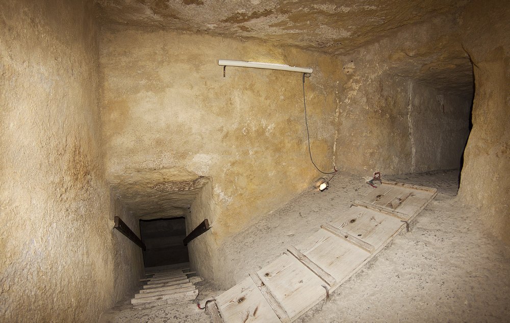 Внутри – три погребальные палаты, расположенные по вертикали одна над другой. От входа под землю спускается нисходящий коридор длиной 105 метров и упирается в другой коридор длиной 9 метров.