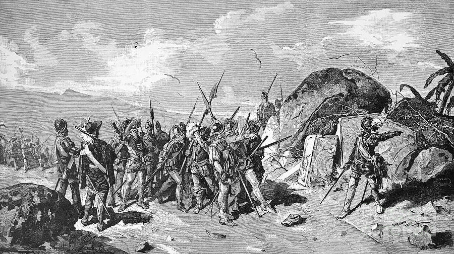 Вскоре после того возвратился из Панамы Альмагро с провиантом и новыми солдатами. Педрариас вскоре после отплытия Писарро умер; новый правитель Дарьенской области Педро Риас усердно помогал Альмагро и обещал вперед оказывать всякое содействие экспедиции. Эскадра поплыла дальше на юг, подвергалась бурям. Испанцы видели по берегу селения, показывавшие, что тут живут цивилизованные люди; увидели наконец большой город, очень обрадовались, но на берег пришли тысячи вооруженных людей, чтобы не допустить иноземцев в свою землю; спутники Писарро и Альмагро испугались.