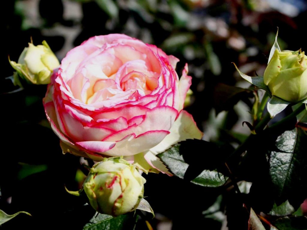 Вид розы флорибунда. Яркая особенность данного сорта — только что распустившиеся бутоны имеют нежно-белый цвет, а уже через несколько дней их окраска постепенно меняется и становится насыщенно-красного тона.