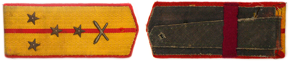 Полевые погоны среднего командного состава на примере мл. лейтенанта артиллерии. Звезда обозначающая звание должна быть серебристой. В данном случае серебрение стёрлось.