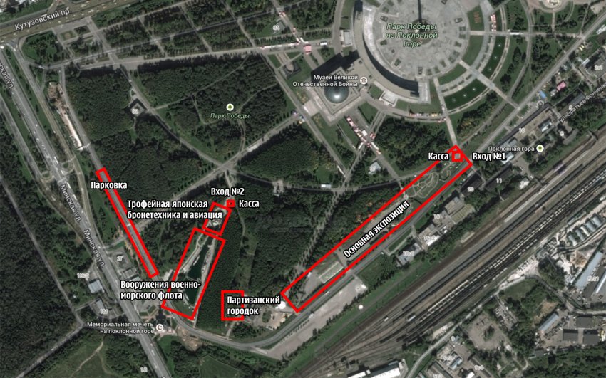 Приехали на своем авто? Когда пересечете МКАД, выезжайте на Кутузовский проспект или улицу Минскую. Первая городская артерия доступна как продолжение Минского-Можайского шоссе (М-1), вторая является фактическим окончанием Ломоносовского проспекта (на более южном участке в него переходят Коломенское шоссе, а затем Нахимовский проспект). Тем, кто попал сюда с Кутузовского проспекта, припарковаться на Поклонной горе можно просто – поверните на Объездную дорогу (стоянка бесплатная и мест тут обычно достаточно). Также припарковаться на Поклонной горе реально на соединении Объездной дороги с улицей Братьев Фонченко (сюда проезжают с улицы Поклонной). Добираясь, до этого тесного парковочного пятачка, где легко попасть в долгий затор, не забывайте про график работы большинства здешних учреждений. Они пускают посетителей до 18 часов, а в пятницу администрация и гиды работают вообще до 16.45. Что касается музея, то во вторник, среду, четверг и воскресенье он работает с 10.00 до 20.30, а в пятницу и субботу – на час дольше (помните, что в музеях кассы закрываются за 30 минут до конца рабочей смены, а понедельник у их работников всегда выходной). Впрочем, даже если вы опоздали, то часть тура осуществима. Открытые экспозиции работают круглосуточно. Что ж, в конце рассказа остается озвучить последний способ припарковаться на Поклонной горе – подъехать на саму Входную площадь (рядом с метро она открывает главный портал парка). Тут вам придется платить. Много сервиса.