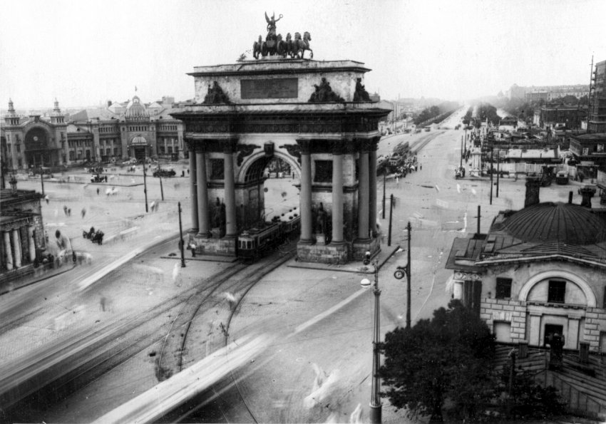 Триумфальные ворота открывают путь посетителям, идущим к Парку Победы. Первоначальный вариант арки, выполненный из дерева (1814), был создан после победоносного завершения войны с наполеоновскими войсками 1812 года. Местом расположения Арки служила площадь Тверской заставы.