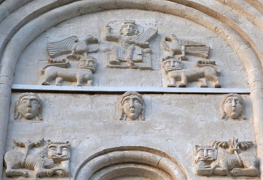 Еще одна нетипичная особенность декора церкви – резные рельефы, изображающие царя Давида. Его фигура является центральной на всех трех фасадах. Помимо Давида, изображенного с псалтирью, на рельефах представлены парные фигуры львов и голубей.