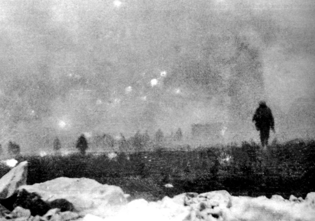 1915 год. Шестнадцать лет спустя после первой Гаагской конференции. Члены 47-й дивизии британской пехоты продвигаются сквозь облако ядовитого газа во время битвы при Лосе.