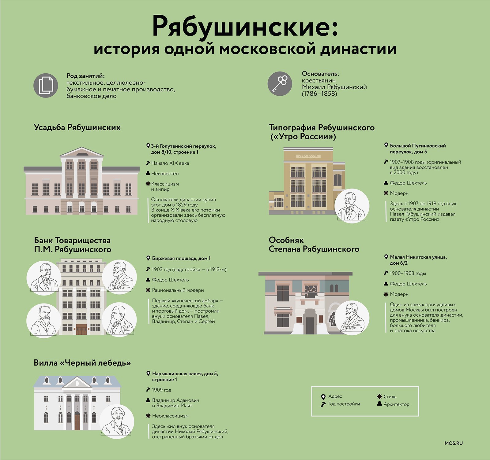 Крестьянину из старообрядческой семьи Михаилу Ребушинскому (Рябушинским он станет позже) было всего 16 лет, когда он переехал в Москву из Калужской губернии. Он мечтал об одном: жить, ни в чем не нуждаясь, потому упорно трудился. Спустя несколько лет он стал купцом третьей гильдии, торгуя в Холщовом ряду Гостиного Двора. Цель была близка, но после войны 1812 года он разорился, как и многие в то время.