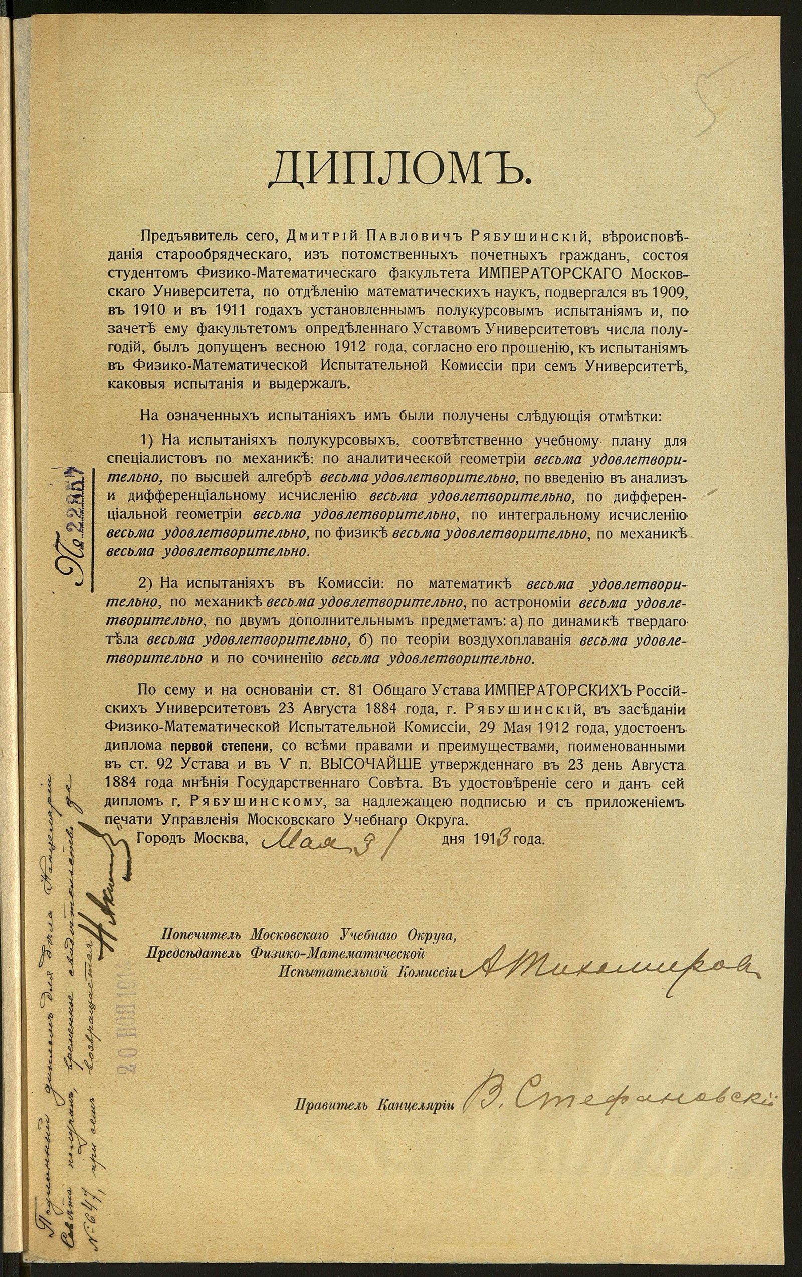 Он стал известен еще в России, когда в 1904 году основал в подмосковном Кучине Аэродинамический институт — первый в Европе. Содействовал ему в этом его учитель — основоположник гидро- и аэродинамики Николай Жуковский. Институт начался с лаборатории по аэродинамике, затем построили дополнительные корпуса, начали приобретать необходимое оборудование. На него Дмитрий Павлович не скупился: только в первый год он потратил около 100 тысяч рублей. Перед этим Рябушинский получил блестящее образование: сначала учился в Практической академии коммерческих наук, потом на физическом факультете Московского государственного университета по специальности «механика». Уже во время работы больше всего его интересовали космические перелеты.