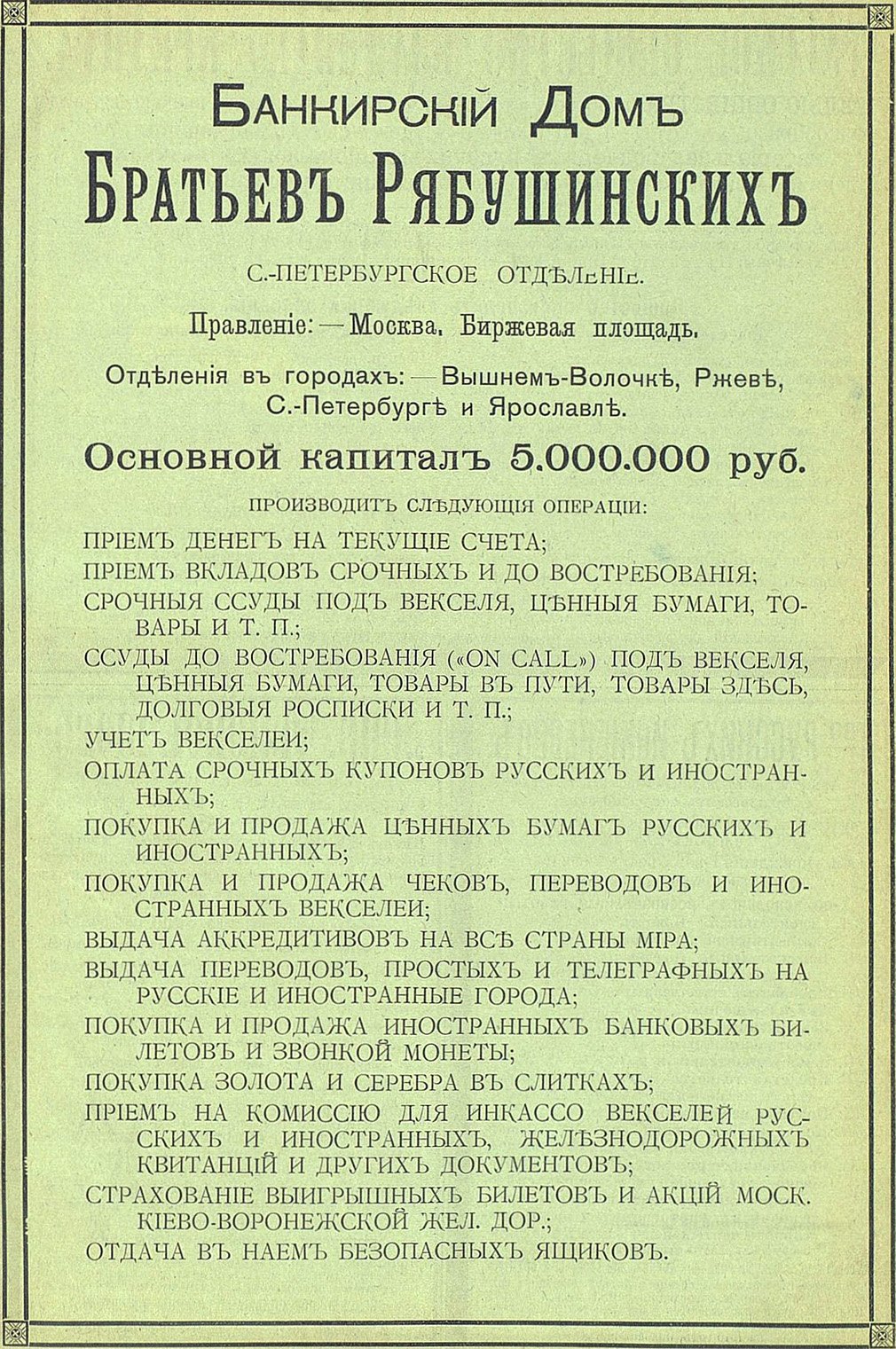 В 1902 году братья создали банкирский дом «Братья Рябушинские», капитал — больше одного миллиона рублей. Финансовым отделом заведовали Владимир и Михаил. Через 10 лет банкирский дом превратился в Московский банк, а к Октябрьской революции 1917-го он был 13-м по величине в стране. Тогда его капитал составлял уже 20 миллионов.