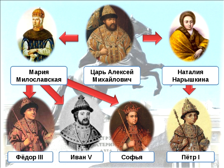 В 1682 г. в результате восстания в Москве правителями становятся сыновья Алексея Михайловича Иван V от первой жены М. Милославской и Петр I от второй жены Н. Нарышкиной. Регентом при них была назначена сестра Софья (1682-1689).