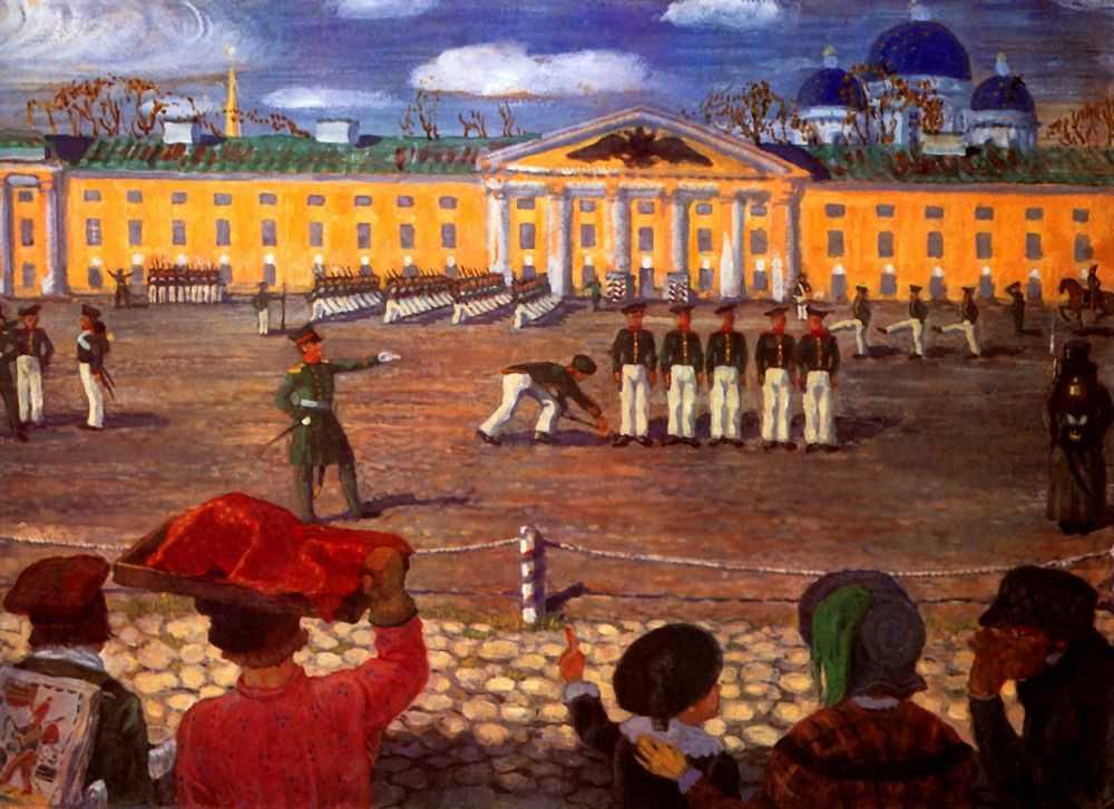 1910-Dobuzhinsky-They lerns at a time of Nicolaj 1Добужинский-Учение новобранцев при Николае 1
