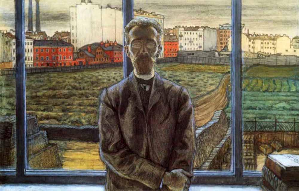 -специализировался на изображении городских пейзажей, но в отличии от Бенуа романтического он показывает Петербург серыми видами, рисует город как монстра, убивающего душу человека. Так, например, на картине «Человек в очках» (1906) художник создаёт сюжет противопоставления героя и города, который рисует за его спиной в окне. Человек показан отрешённым, сильно усталым, погружённым в свои мысли. На лице-полная опустошённость. И это на фоне унылых городских домов.
