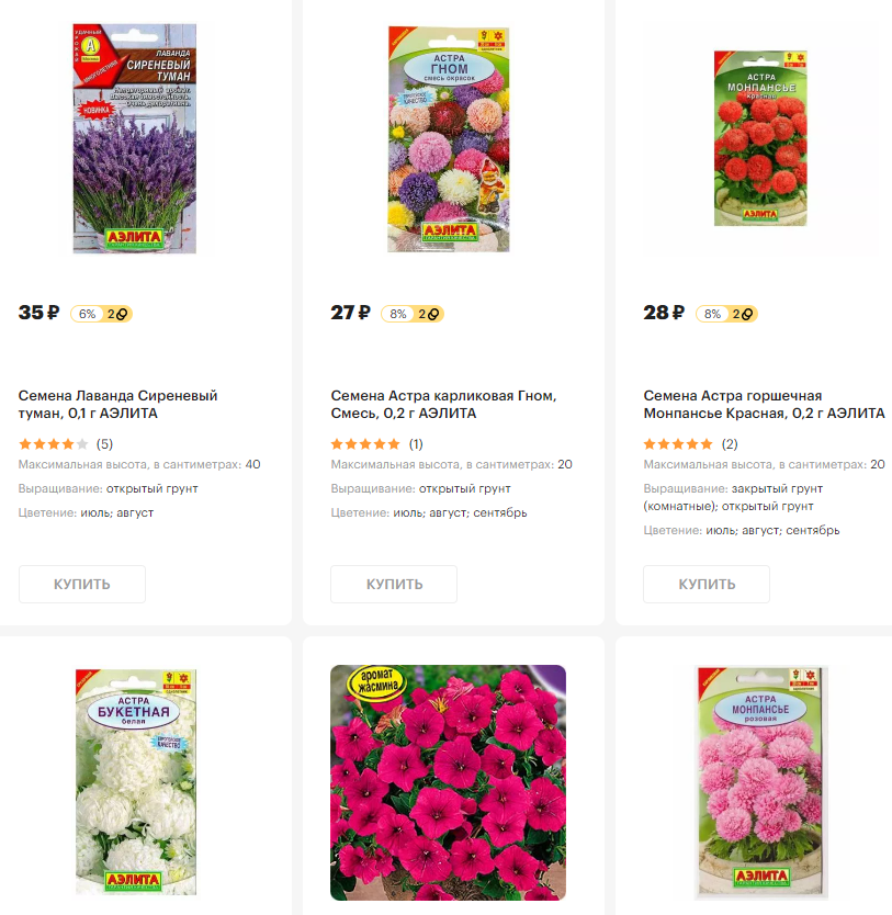 - «Аэлита». Еще один производитель, представляющий один из самых широких ассортиментов на рынке. Семена всех этих астр, календул, хризантем и садовых роз не нуждаются в сортировке, обработке химическими препаратами и прокаливанию, будучи готовыми к посадке даже в открытый грунт. Цена – от 12 руб. за 0,2 г.