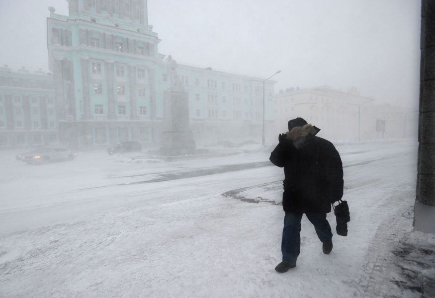 Еще одна точка на карте России, где -50 °C – это норма – Норильск. Зима в городе длится 9 месяцев, самый холодный из них – январь. Холодно так, что выпавший снег моментально твердеет до состояния асфальта. Убирают глыбы ковшом трактора.