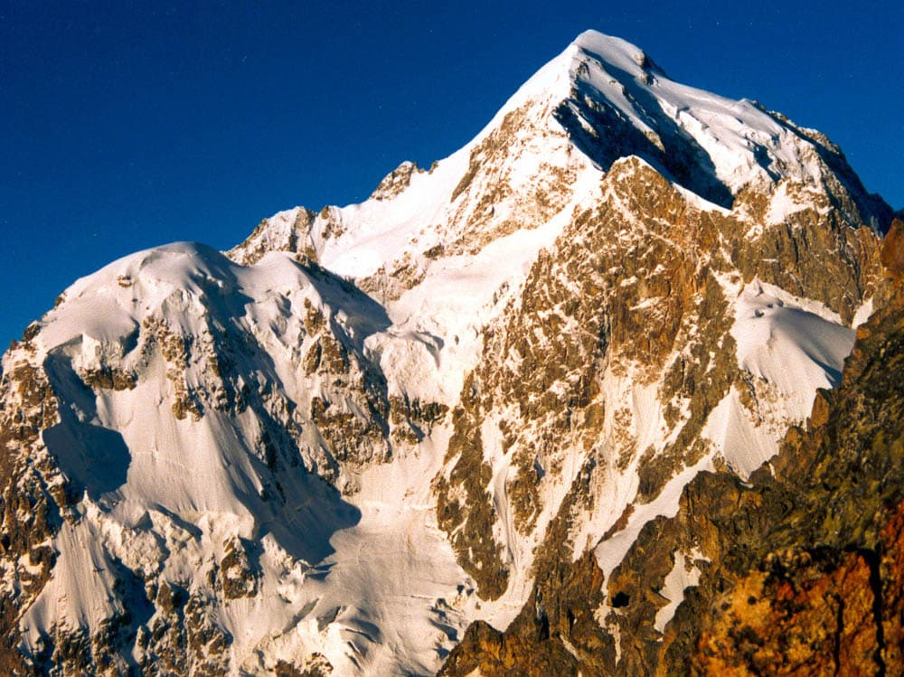 Красивейшая вершина сверкает на солнце не только благодаря ледникам. Она состоит из кристаллических сланцевых образований и гранита.