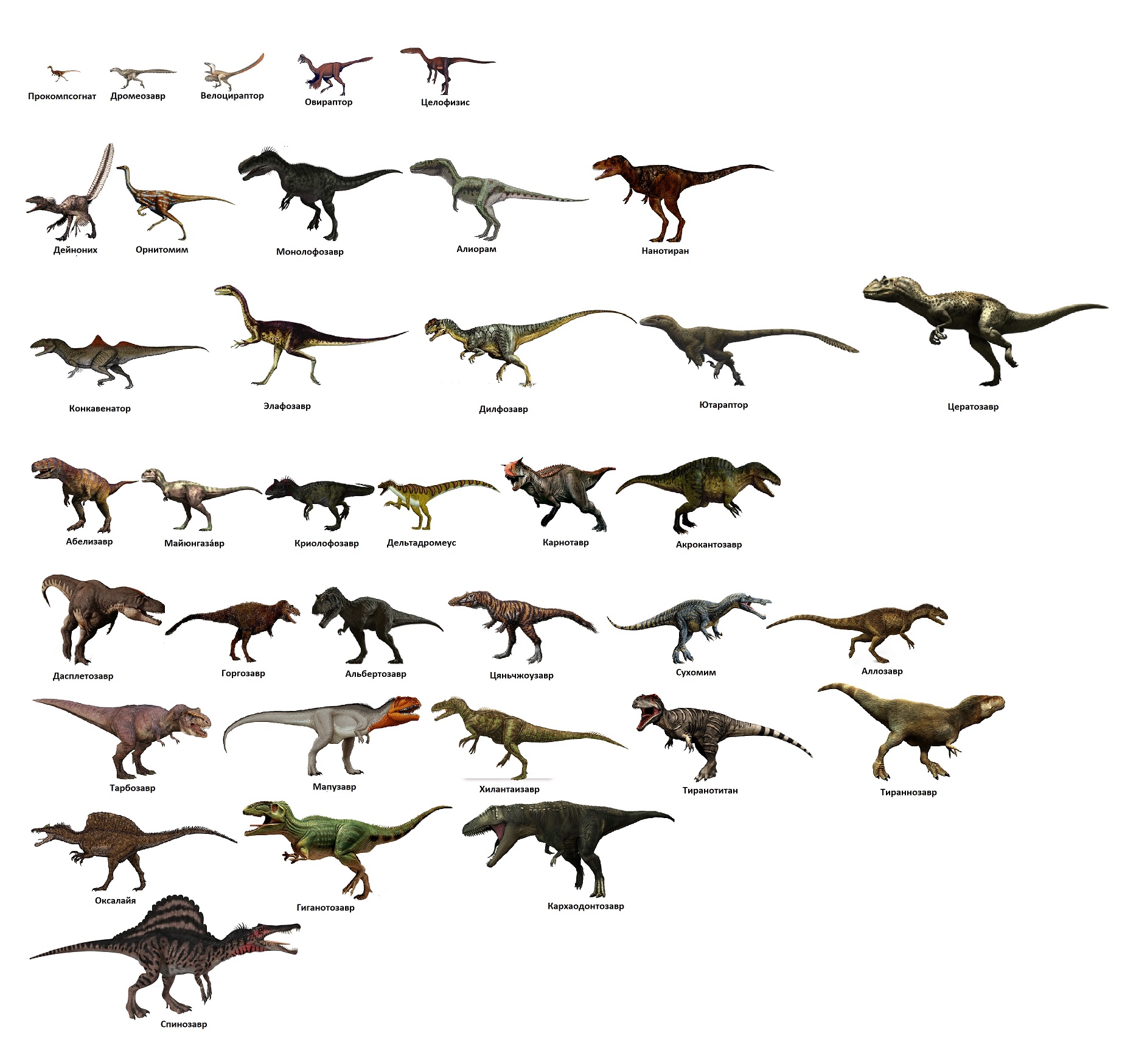 Мелкие, подвижные, маневренные и прыгучие птицеподобные динозавры (велоцираптор, орнитомим); - Карнозавры (хищные тероподы).