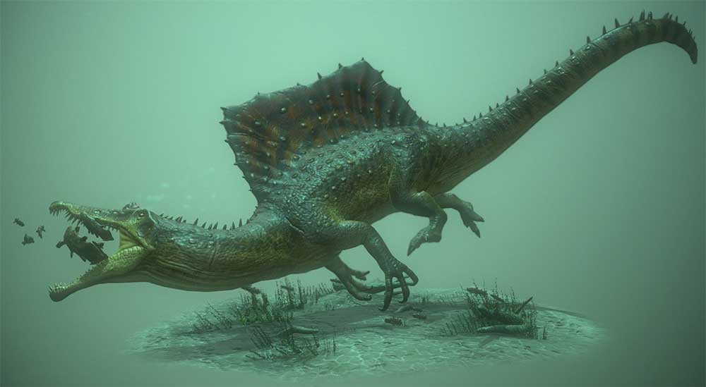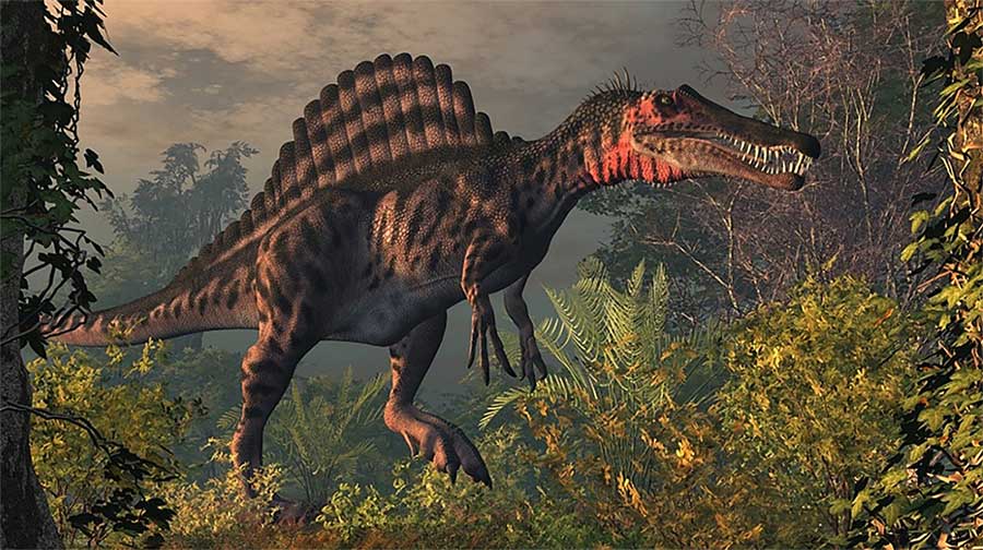 Спинозавр – самый большой хищный динозавр в мире. Крупнейший найденный образец этого вида имел длину около 16 метров, и массу тела, предположительно, от 11 до 17 т. Позвоночные отростки похожи на трапециевидный парус. Ученые не могут прийти к общему мнению, для каких целей он предназначался.