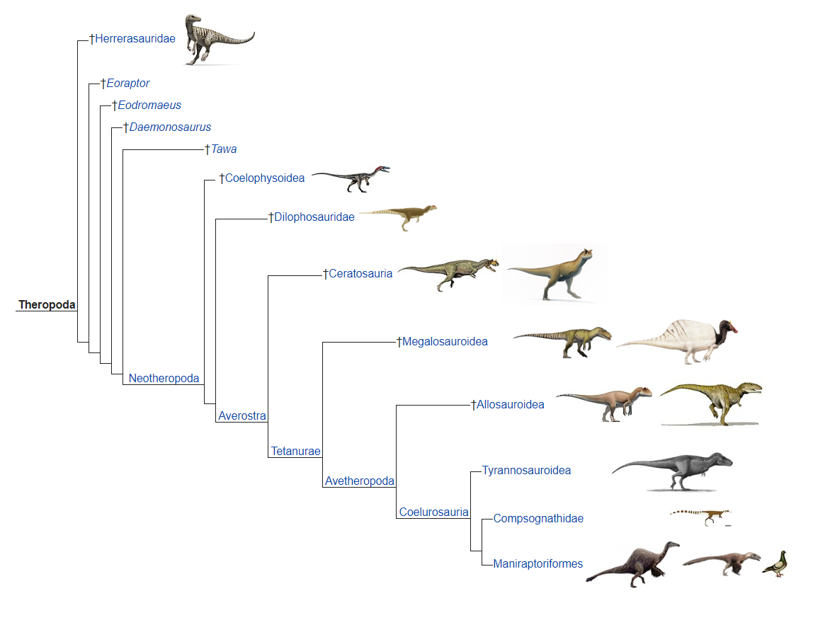 - группу тетануры, включающую семейство мегалозавридов, род газозавров, группу аветеропод (разделяется на группу карнозавров, целурозавров).