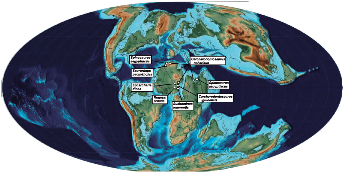 Распространение кархародонтозаврид, абелизаврид и спинозаврид в среднем Мелу. Авторство изображение CR Scotese Paleomap.