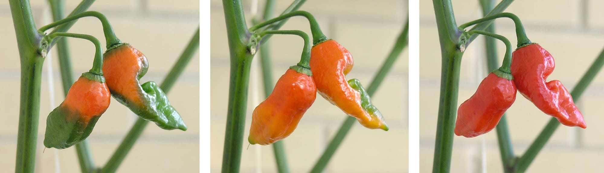 При созревании «скорпионы» необычайно зрелищно меняют свой цвет с зелёного на красно-оранжевый. Фишка в том, что изменение окраски происходит сверху вниз на протяжение одного-двух дней и выглядит так, как будто оранжевая краска медленно стекает по плоду, постепенно окрашивая его целиком: