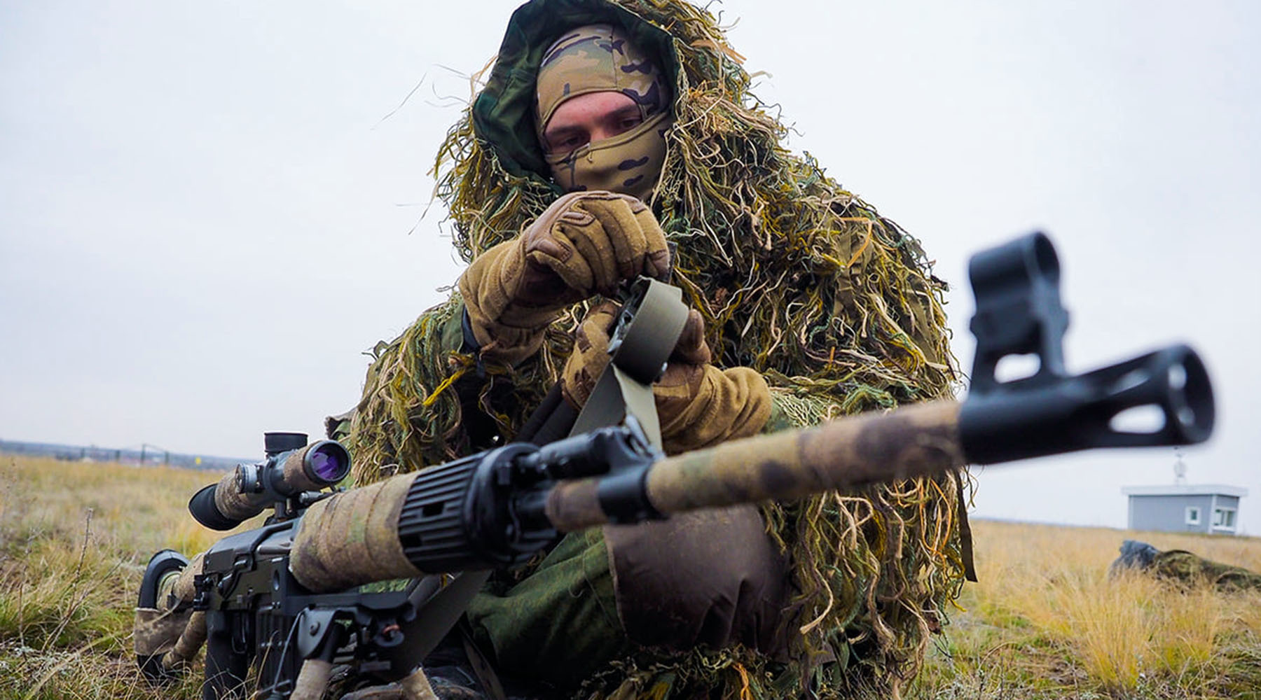 - Снайпер в маскировочном обмундировании готовит винтовку к стрельбе