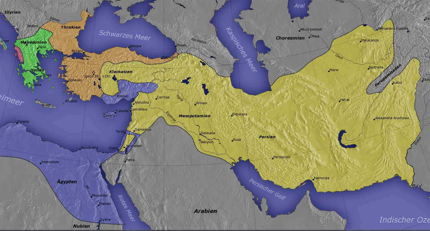 Уже до 303 г. до н.э. в состав царства Селевкидов вошли все верхние сатрапии — Мидия, Персида, Сузиана (Элам), Бактрия и Парфия, а после битвы при Ипсе — Северная Месопотамия, Северная Сирия и значительная часть Малой Азии