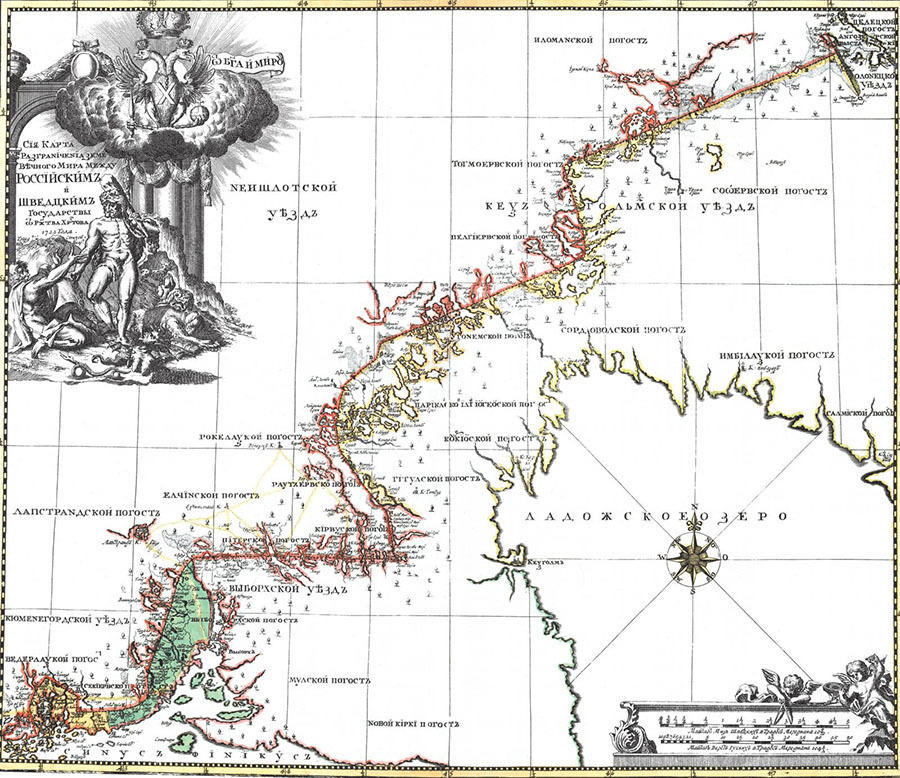 - Карта разграничения земель между Российским и Шведским государствами согласно Ништадтскому мирному договору (1722)