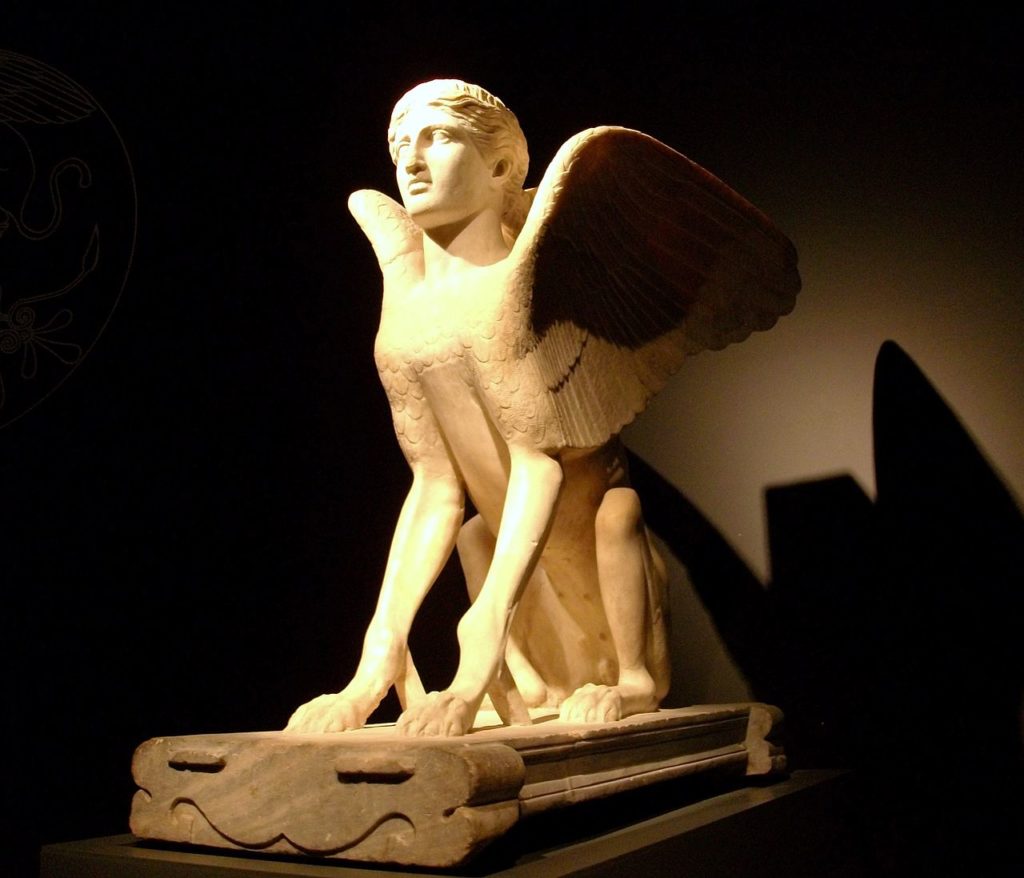 Первые упоминания Сфинкса, как персонажа, дошли до нас из древнегреческой мифологии. Согласно ей, Сфинкс был порождением Тифона и Ехидны, а выглядел и вовсе ужасающе. Греки изображали его как существо, обладающее женской головой, лапами и телом льва, крыльями орла (грифона) и хвостом быка.