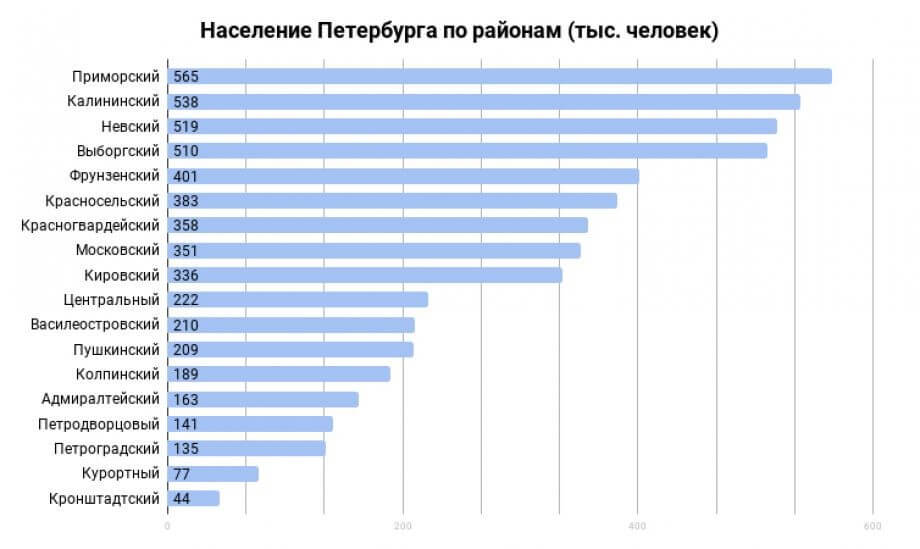 Большее число жителей Санкт-Петербурга проживает в Приморском, Калининском, Невском, Выборгском и Фрунзенском районах. Самый маленький процент заселенности показывают Курортный и Петроградский районы. Ощущаемая плотность населения повышается в летние, туристические периоды времена года. Летом больше всего людей находится на территории отнюдь не спальных районов. Переполнены центральные части города, так как туристические потоки перемещаются именно в архитектурно-исторических земель Петербурга.