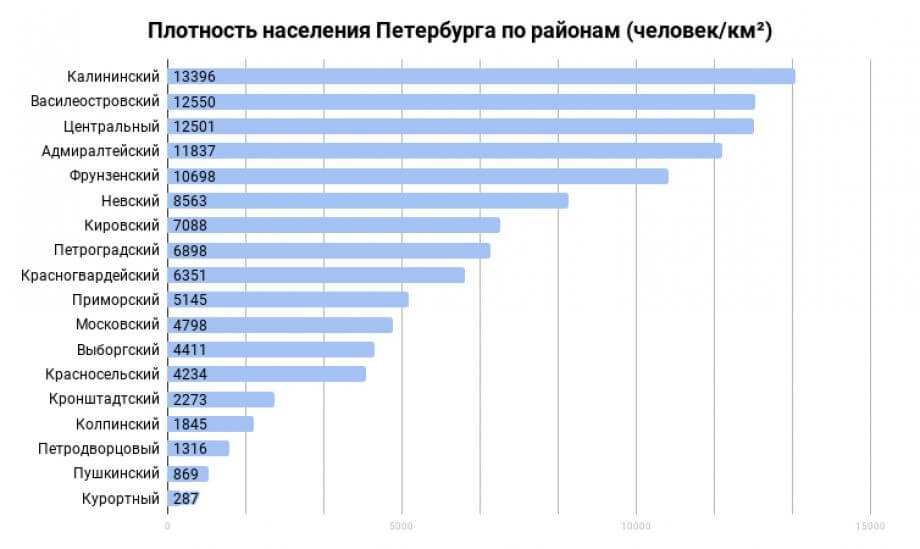 Посмотрев ту же статистику – плотность населения, но уже в параметре одного человека на один квадратный метр, можно заметить, что густонаселенными центрами являются Калининский, Василеостровский, Центральный и Адмиралтейский районы. Все эти территории находятся на небольшом удалении от центра, и включают в себя не только спальные районы, но и объекты туристического, экономического и промышленного значения.
