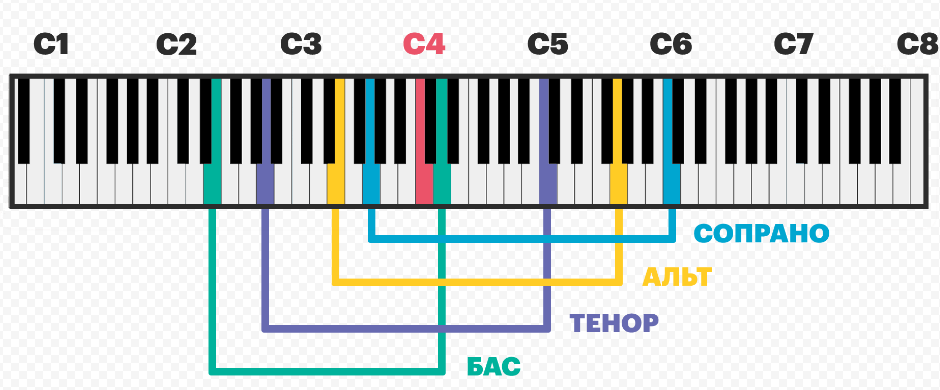 Вот наглядная схема расположения октав и местоположение для каждого типа голоса.