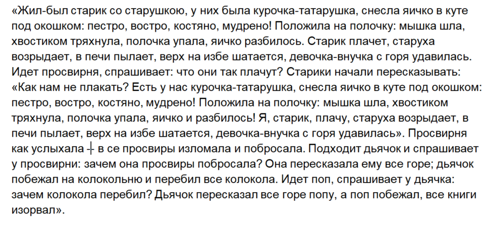 Жили старик со старухой. И была у них курочка рябушечка стара старушечка. Снесла яичко в сенцах на полке, на ржаной соломке. Откуда мышка ни взялась, расколола это яичко. Деда плачет, баба горюет, сорока ногу изломала, тын расшатался, дуб с себя листочки посшибал. Попова дочь за водой пошла, вёдра разбила, пришла домой без воды. Попадья спрашивает: «Что ты дочь, без воды пришла?» Она рассказывает: Какое на меня горе, какое на меня великое: «Жили старик со старухой. И была у них курочка рябушечка стара старушечка. Снесла яичко в сенцах на полке, на ржаной соломке. Откуда мышка ни взялась, расколола это яичко. Деда плачет, баба горюет, сорока ногу изломала, тын расшатался, дуб с себя листочки посшибал. А я за водой пошла, вёдра разбила, коромыс разбила. Хоть ты попадья покидай с горя пироги за окошко!» Попадья с горя и выкинула пироги за окошко. Поп идёт: «Что это ты, поподья, делаешь?» А она отвечает: «Какое на меня горюшко, какое на меня великое. Жили старик со старухой. И была у них курочка рябушечка стара старушечка. Снесла яичко в сенцах на полке, на ржаной соломке. Откуда мышка ни взялась, расколола это яичко. Деда плачет, баба горюет, сорока ногу изломала, тын расшатался, дуб с себя листочки посшибал. Наша дочь за водой пошла, вёдра разбила, коромыс разбила. А я с горя покидала все пироги за окошко. А ты, поп, хоть с горя об косяк расшибись!» Поп разбегся, да как ударится об косяк! Тут и помер. Стали попа хоронить и поминки справлять. Вот какое яичко-то дорогое!