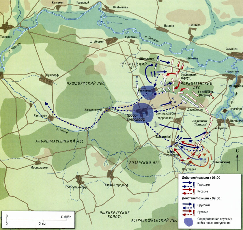 Русской армии не удалось быстро взять Кенигсберг. Враг справа от р. Прегель прочно укрепился. Поэтому было решено нанести основной удар в обход через Алленбург. Войска переводятся на левое побережье Прегеля и занимают позицию в лесистой зоне у Гросс-Егерсдорфа.