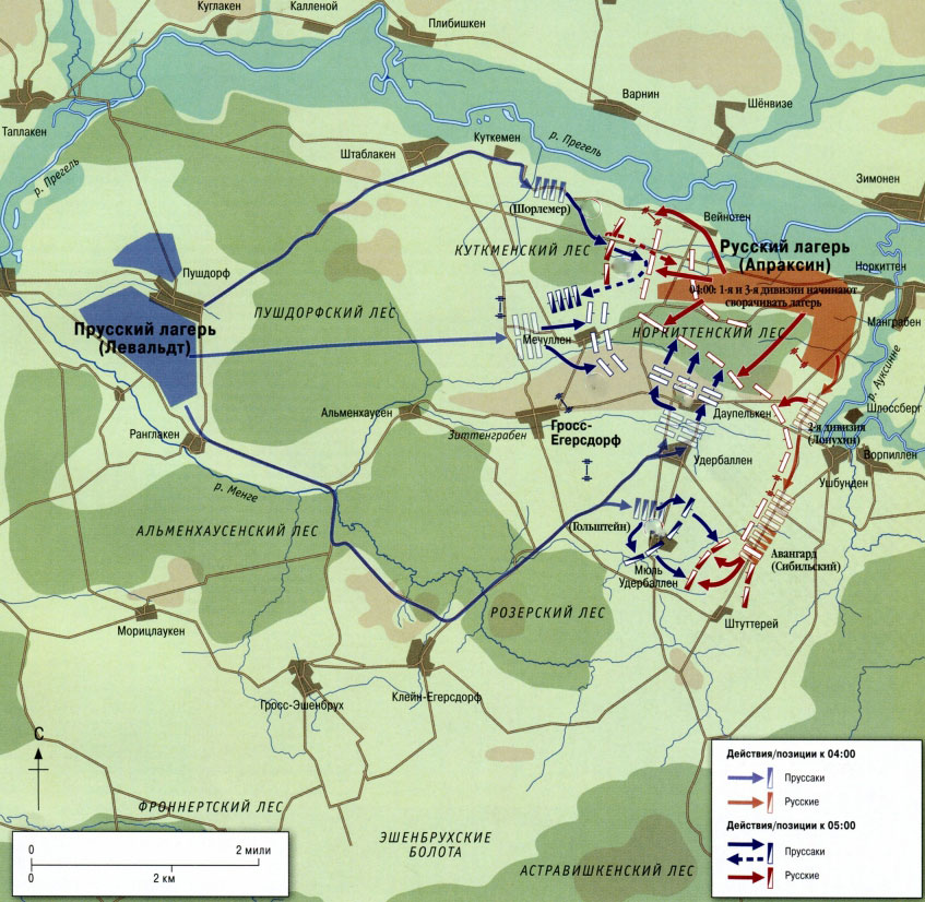 Апраксин избрал весьма неудачное место для лагеря. Дело в том, что из него было два узких и неудобных выхода – у леса с оврагом и леса с болотом. Многотысячная русская армия с обозом и артиллерией должна была протискиваться сквозь них буквально побатальонно. Тем не менее приказ выступать был отдан в ночь на 30 августа. Апраксин не знал, что в это время с часу ночи прусская армия в боевом порядке марширует к русскому лагерю. К 4 часам утра с музыкой, знаменами в развернутом строю, в две линии с кавалерией на флангах пруссаки натыкаются на выходящих в походных колоннах русских.