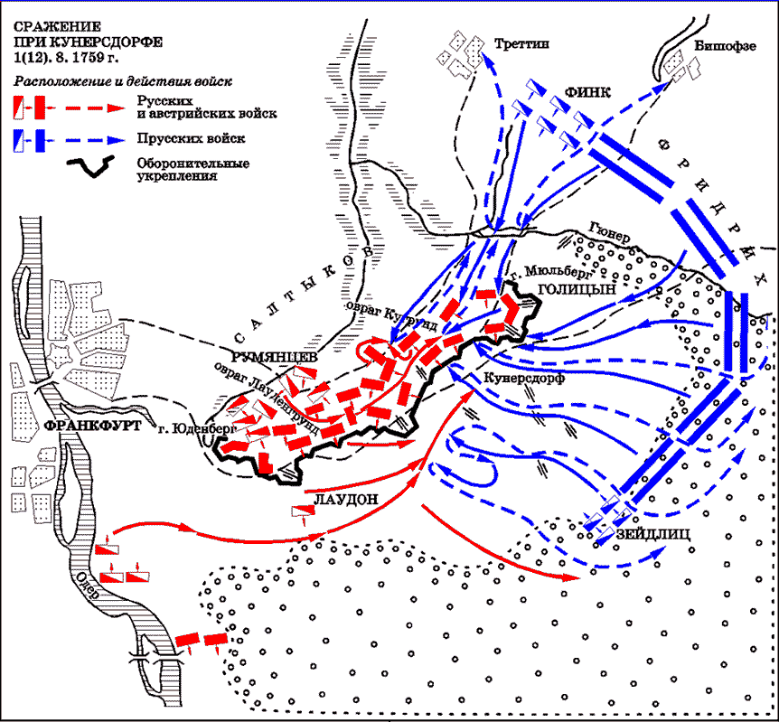 8 мая 1759 года главнокомандующего русской армией Фермора заменили П.С. Салтыковым. 7 июня войска выступили на запад, к реке Одер, намереваясь соединиться с австрийцами в окрестностях города Кросен. Новый главнокомандующий принес ожидаемые военные успехи: 23 июля русская армия в сражении при Пальциге разбила корпус прусского генерала Веделя. А 3 августа союзные части объединились во Франкфурте-на-Одере.