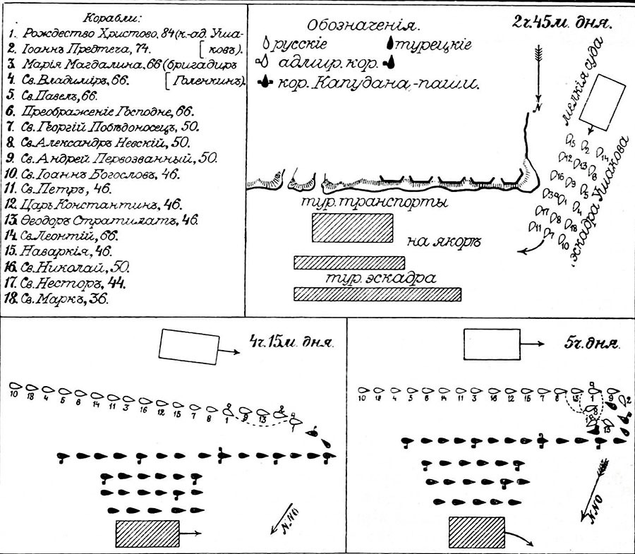 Именно так и случилось: турецкие корабли сгрудились и стали сталкиваться друг с другом. Русским же кораблям, идущим с попутным ветром на всех парусах, левый галс, напротив, был благоприятен: он помог быстро выставить суда в батальную линию.