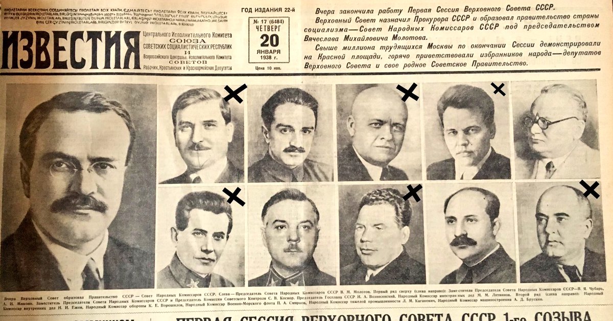 Ленину, Ногину, Луначарскому и Скворцову-Степанову повезло умереть до 1937 года. Иначе бы на этом изображении было ещё 4 зачёркнутых фотографии
