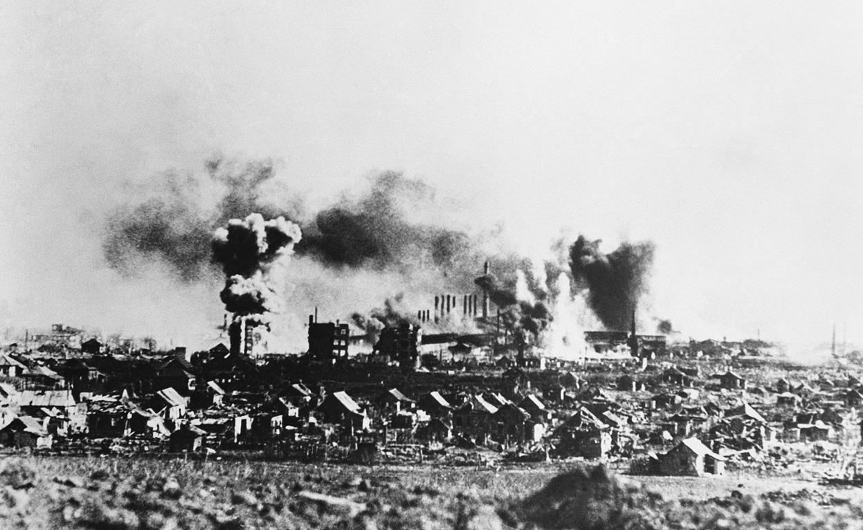 Бомбежка Сталинграда 23 августа 1942 г продолжалась с 16 до 19 часов. После неё город представлял собой руины, в которых там и сям бушуют огненные смерчи. Разлившиеся в Волгу нефтепродукты пылали ещё очень долго.