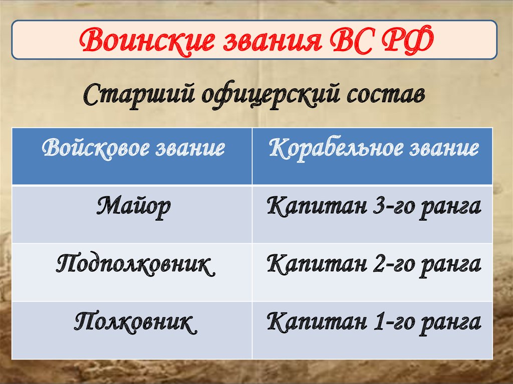 К старшим офицерам в армии причисляют следующие воинские звания, по возрастанию: