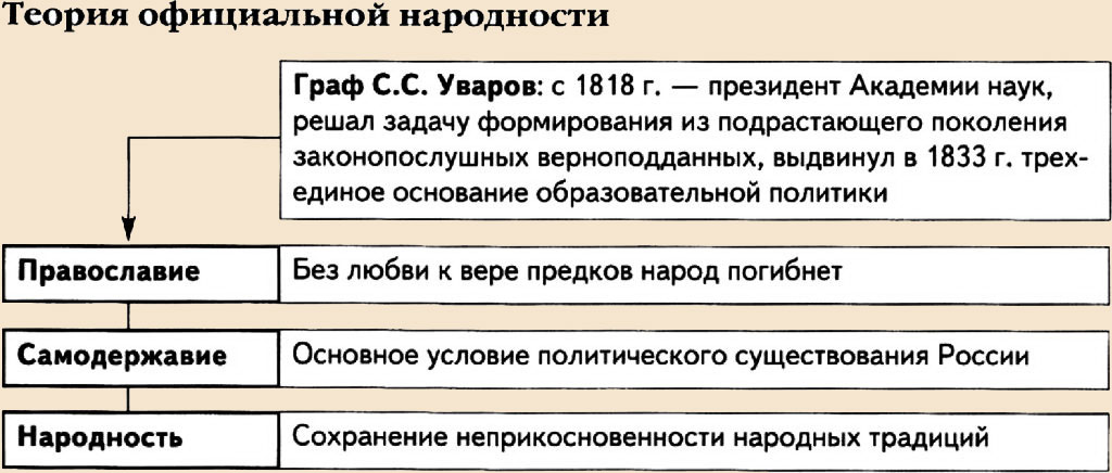 Для идеологического обоснования самодержавия министр народного просвещения граф С. С. Уваров создал теорию официальной народности; Она была основана на трех принципах: самодержавие, православие, народность.