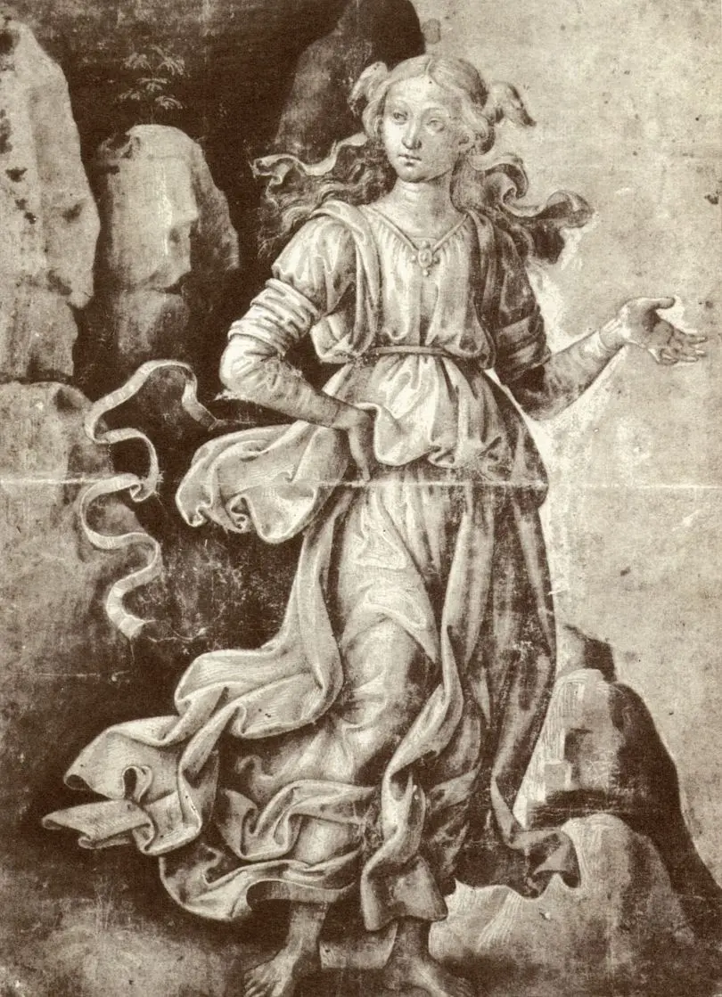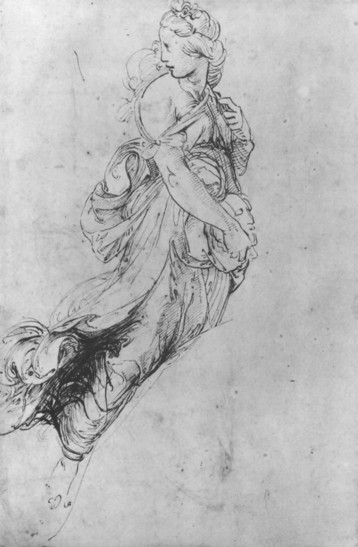 Муза Клио, или девушка перед скалой. Джованни Санти. Графика, XV век. Королевская библиотека, Виндзор, Великобритания