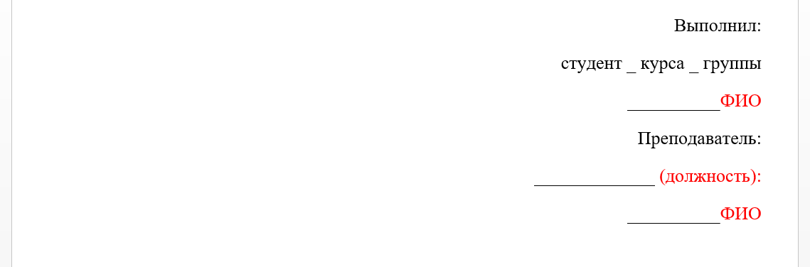 - Через 5−9 пустых строк необходимо подписать работу: «Выполнил ученик N класса Ф. И. О.» или «Работу выполнил студент N курса очного/заочного отделения Ф. И. О.». Также студенты должны заполнить данные проверяющего: «Работу проверил научное звание (доцент, кандидат наук) и Ф. И. О.» или «Научный руководитель научное звание и Ф. И. О.». Эти данные пишутся с правой стороны, но первые буквы выравниваются по одной вертикальной линии (то есть пишутся друг под другом). Это можно сделать при помощи кнопки TAB в Word.