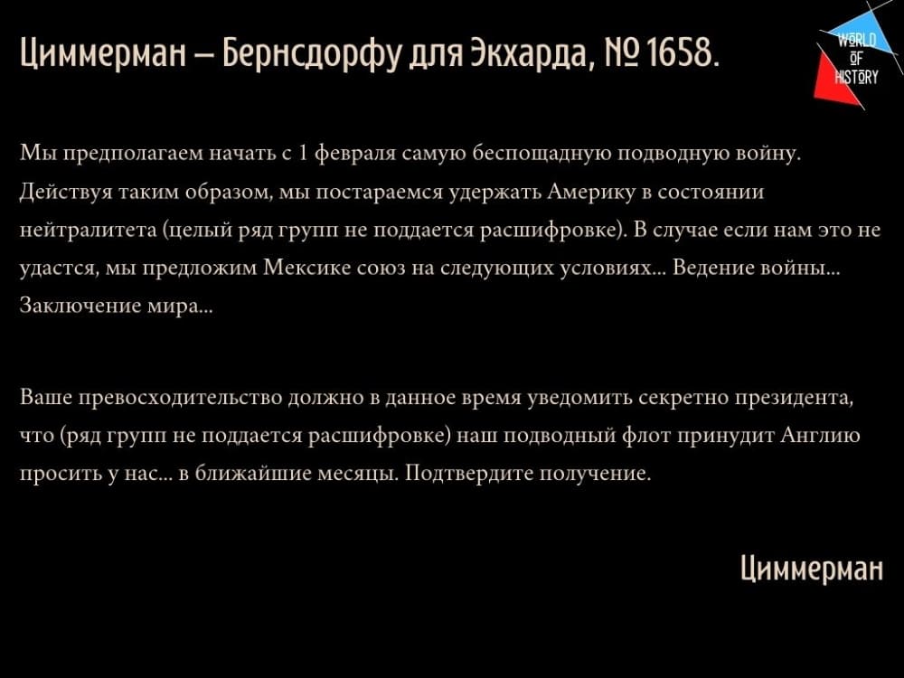 Окончательной каплей послужила «Телеграмма Циммермана» — тайное письмо министра иностранных дел Германии к правительству Мексики с предложением начать войну против США и получить Техас и Аризону. 6 апреля 1917 года Штаты вступили в войну на стороне Антанты.