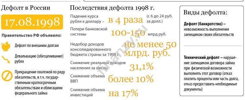 Мы описали дефолт 1998 года в России кратко, объяснили, почему произошел кризис. Последствия дефолта 1998 имели свои плюсы и минусы: