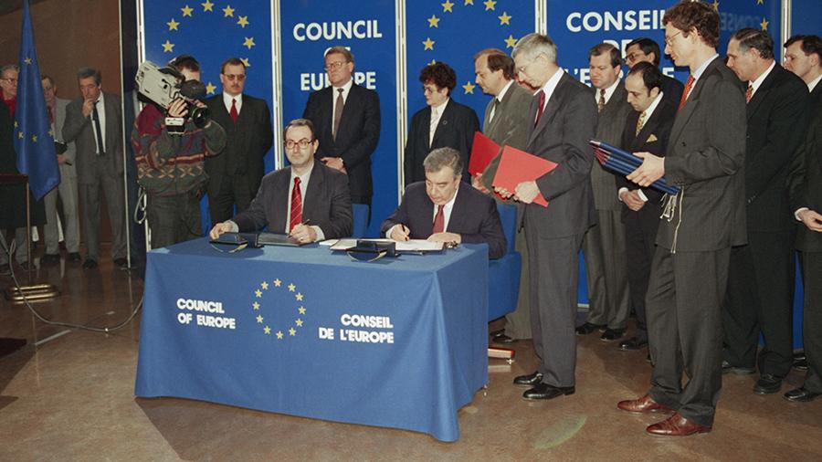 28 февраля 1996 года. Министр иностранных дел России Евгений Примаков (справа) и генеральный секретарь Совета Европы Даниэль Таршис подписывают документы во время официальной церемонии вступления России в Совет Европы